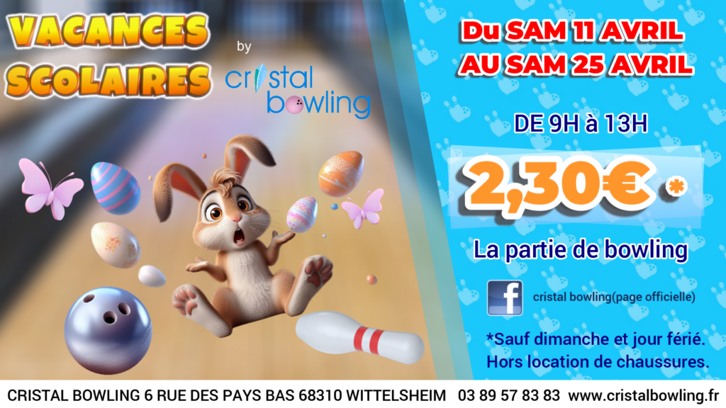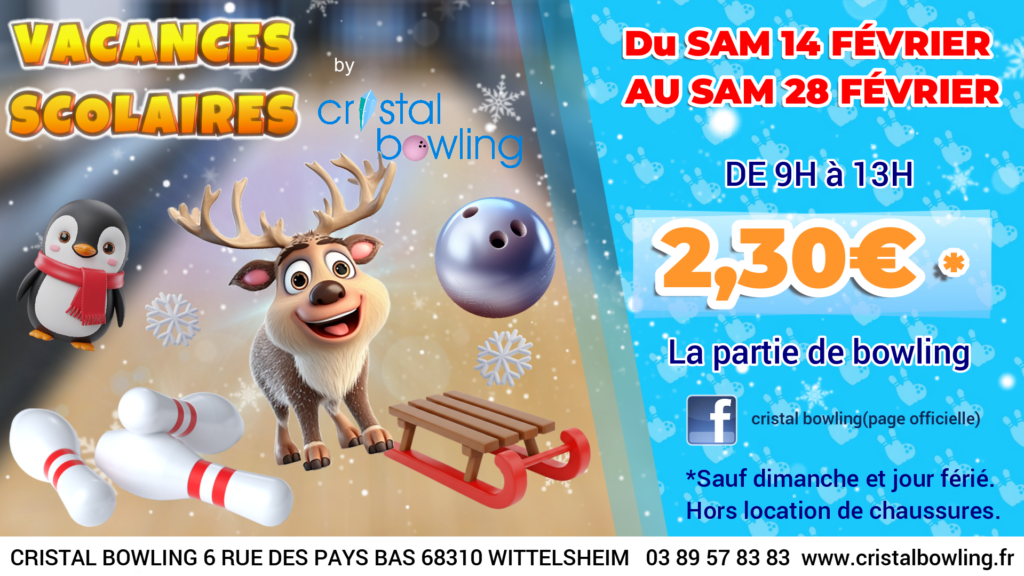 Situé à Wittelsheim et facilement accessible, Le Cristal Bowling vous ouvre ses portes toute l’année. Nous sommes ouverts 7 j/7, jusqu’à 1 h 30 du matin du dimanche au jeudi et jusqu’à 3 h du matin les vendredis et samedis. Avec ses 4100 m² dédiés au loisir, notre établissement se distingue comme la référence en matière de bowling dans le Haut-Rhin.